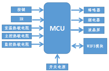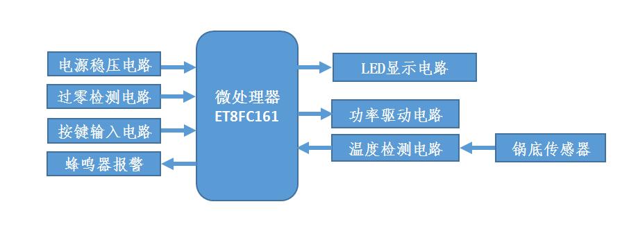 該系統(tǒng)由輸入部分、輸出部分組成。輸入部分包括電源部分、過零檢測(cè)電路、按鍵控制電路。單片機(jī)采用ET8FC161作為控制器,輸出部分包括LED顯示、蜂鳴器報(bào)警??蓪?shí)現(xiàn)吸水、加熱、沸騰、燜飯和膨脹功能。